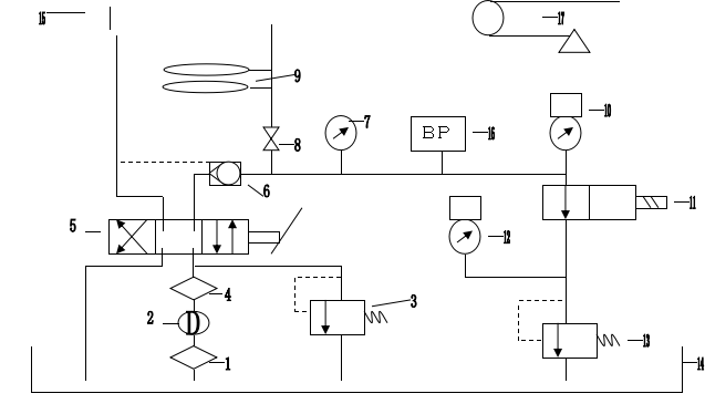 13、溢流閥 14、油箱 15、接緊油缸 16、壓力變送器 17、張緊小車(chē)