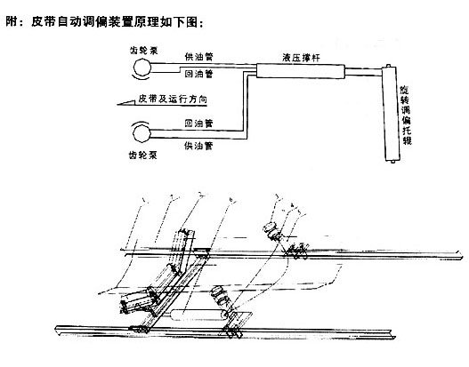 液壓調(diào)正裝置是由檢驅(qū)輪、油泵、復(fù)合油缸、油管總成、固定機(jī)架構(gòu)成。當(dāng)皮帶運(yùn)行跑 偏時(shí),皮帶與檢驅(qū)輪接觸,檢驅(qū)輪帶動(dòng)油泵旋轉(zhuǎn),輸出壓力油控制驅(qū)動(dòng)油缸往復(fù)運(yùn)動(dòng),帶動(dòng) 調(diào)心托輥偏轉(zhuǎn),使調(diào)心托輥的線運(yùn)動(dòng)方向與皮帶的運(yùn)動(dòng)方向形成一個(gè)夾角,產(chǎn)生的摩擦力驅(qū) 動(dòng)皮帶,使皮帶始終在設(shè)定的范圍內(nèi)運(yùn)行,從而避免皮帶跑偏造成散料及皮帶與皮帶機(jī)機(jī)架 摩擦撕帶,達(dá)到保護(hù)皮帶機(jī)正常運(yùn)行之目的。