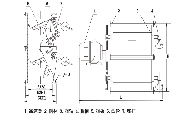 由減速器帶動傳動桿通過曲柄、凸輪及連桿分別帶動上、下兩傳動軸旋轉,交互開啟,通過配備的杠桿系統(tǒng)或拉伸彈簧,保證閥板可靠的復位,防止野風吹入,依確定的開閉頻率完成系統(tǒng)的給卸料。